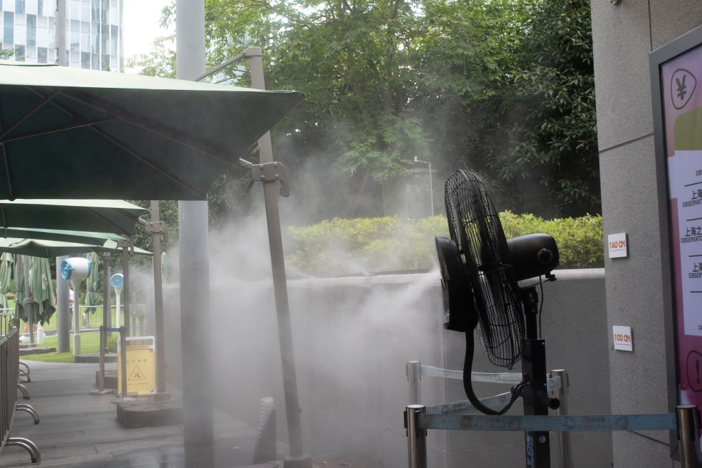 Abanicos con difusor de agua para refrescarnos mientras hacíamos fila para comprar boletos para la Torre de Shanghai.