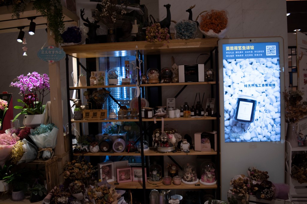 Puesto de flores, el pago se puede realizar por medio de WeChat Pay.