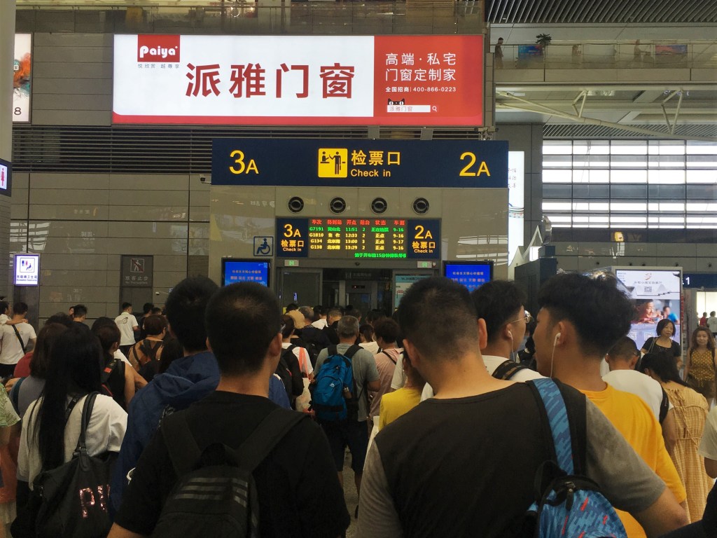Esperando para abordar el tren en dirección a Huangshan Norte.