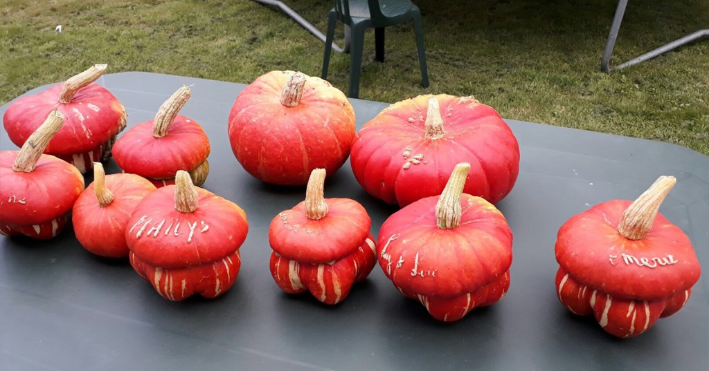 Detalle: mi suegro hace grabaciones en las calabazas. Aqui les escribió nuestros nombres.